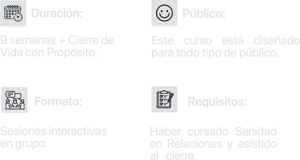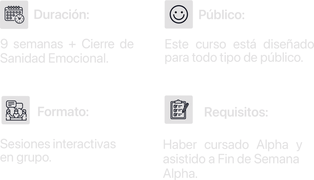 Sanidad Emocional es la segunda etapa del proceso de formación cristiana. Está pensada para ayudarnos a integrar la salud emocional con nuestra fe, aplicando principios bíblicos que, al ponerlos en práctica, nos guían a sanar nuestras emociones y, en el proceso, crecer espiritualmente.